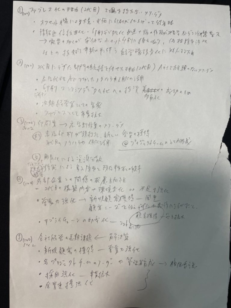 設問文からだけでも、これは2代目経営者のもとで行われたこと、「ファブレス“化”」ということは元は印刷工場を持っていたのであろうことが推察できます。