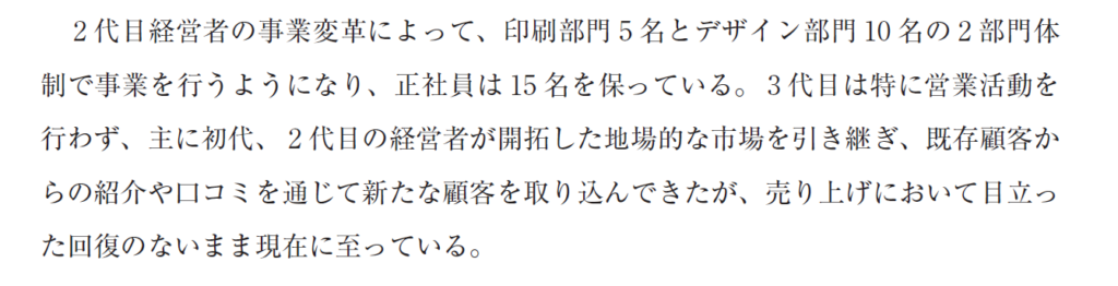 また、最後の段落をよむことで、この事例(企業)の解決すべき問題テーマを把握します。