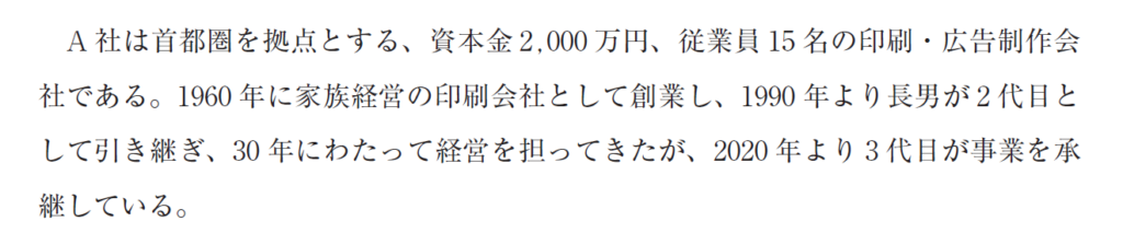 ここで登場する3代目はただの後継者候補ではなく、「“A社での経験のなかった”3代目」ということがポイントです。既存事業の経営・技術承継等を進めるのであれば、A社で経験があるに越したことはありません。そうなると既存事業ではなく、イノベーションが必要な新規事業関連で能力発揮を期待したから?など、この一文がヒントとなり予想することができます。