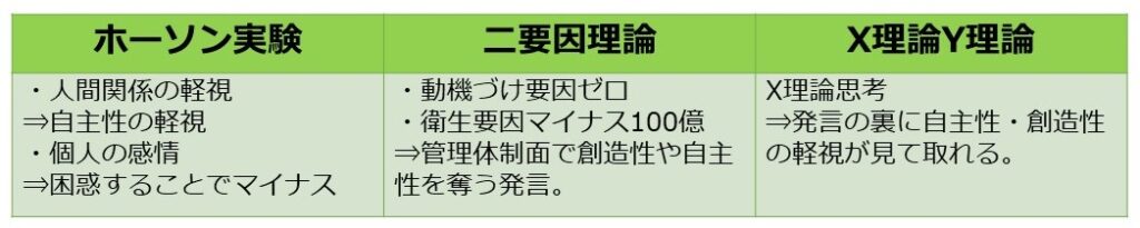 ①X理論・・・マズローの低次欲求(生理的欲求、安全の欲求)をベースとした行動モデル。命令や強制で管理してアメとムチによるマネジメント手法。