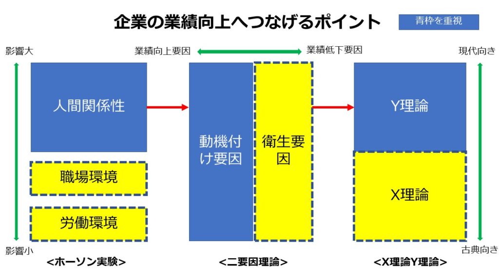 そこで、3つの理論の因果関係をこじつけまして「企業の業績向上につなげるポイント」として図にまとめてみました。