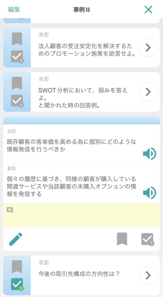 上記で整理した(賢人の皆さまのファイナルペーパーから拝借した)情報を、暗記カードアプリに入力し、通勤時に耳で聴く学習を取り入れました。