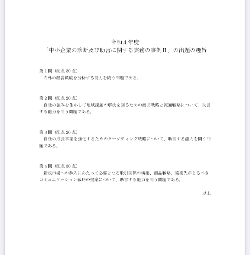『全受験者の採点が一通り終えた後、50〜55点前後の団子状態の受験者を横並びにして、加点という下駄を履かせていくことで、合格者数(合格者の割合は毎年ほぼ一定)を調整していく。下駄無しで合格水準に達するバケモノ受験生は一握り。つまり、全事例で50点レベルの解答が書ければ合格圏内である。また、事例Ⅳの下駄(=加点要素)が一番大きいケースが多いので、4科目目の最後の1秒まで諦めず喰らいつくこと』
