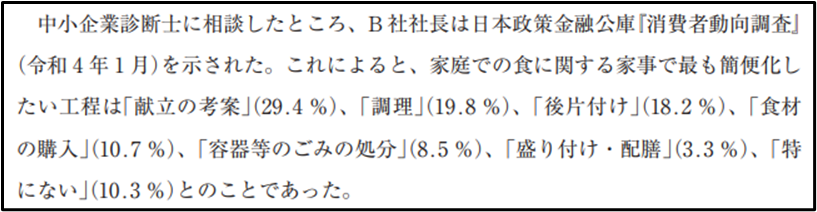 コンサルテーションを求める取引先飲食店の店主:自社工場で蓄積した高度な加工技術を生かし、メニュー提案や半加工を請け負う。