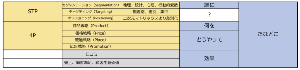 この設定で、STP+4Pと”だなどこ”に沿った戦略を図にしました。