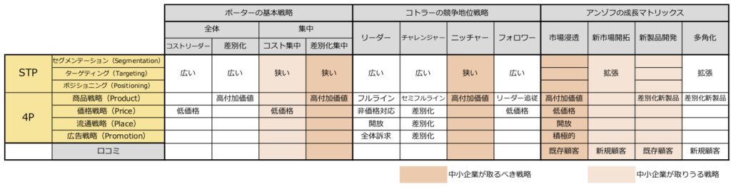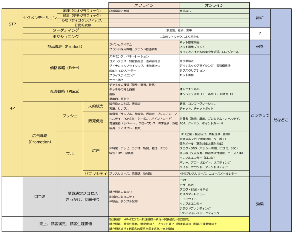 さて前述の事例Ⅱの特有の戦略と、この章の一般戦略を合わせると、STP+4P(+口コミ)にすべてが入ってしまいました。ということは、STP+4P(+口コミ)を使いこなせれば、事例Ⅱのすべての戦略に対応できそうです。