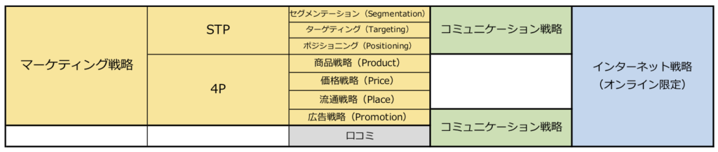 基本のマーケティング戦略を、オンラインに制約すればインターネット戦略、そしてSTP+4Pに口コミを足せばコミュニケーション戦略になります。○○以外の戦略との設問もこれでわかりやすくなりました。受験生時代には名前のある戦略にビビっていたのですが、こうやって見ると、STP+4P+口コミ戦略を使いこなせればすべての設問に対応できることになります。