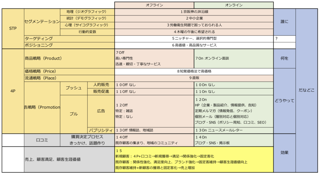 ターゲティング(Targeting)は中小企業なので集中で決定、ポジショニング(Positioning)はよくわかりません。あとは”だなどこ”が対応している、S+4P(+口コミ)です。ここに書くべき文言を考えます。インターネット戦略を区別するために、4Pはオンラインとオフラインに分けました。また価格戦略(Price)は最近出たことはありませんので白塗りにしました。