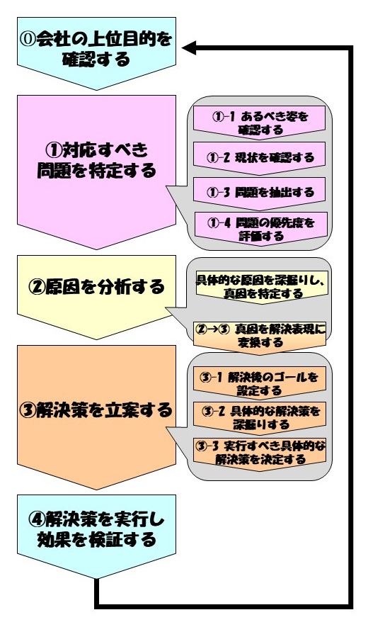 私は一時期、ITシステム開発のデスマーチ化したプロジェクトからお声がかかると、そのメンバーと一緒に原因分析と解決策立案を行うという、 “問題解決” の実務を担当しておりました。このとき、ベースとなる考え方が、世にいう ”問題解決プロセス” です。ググってみると色々出てきますが、一般的にはこんな流れ。