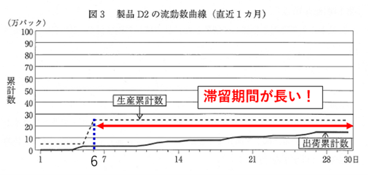 このグラフを見ると生産した製品(製品D2)がなかなか出荷されず、