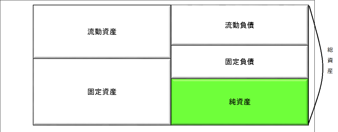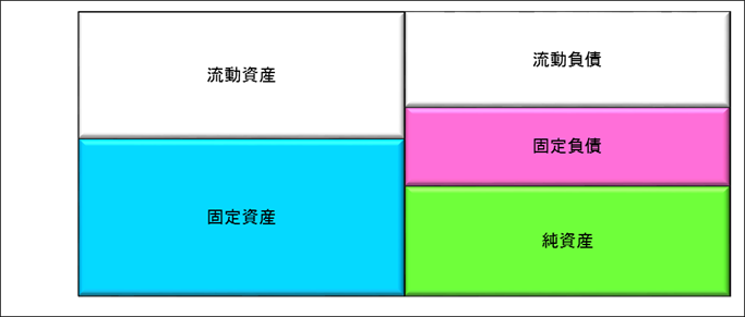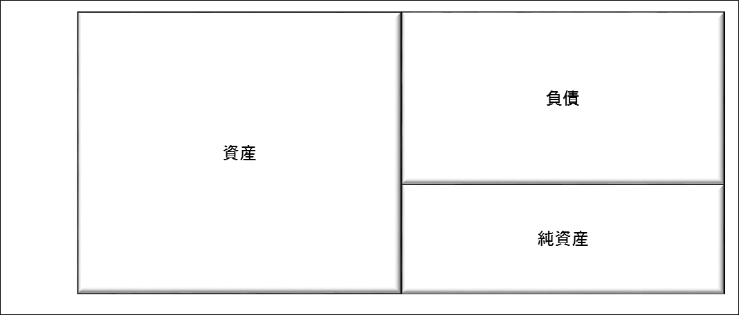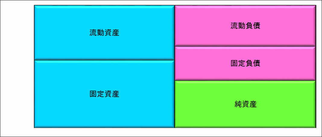 経営分析の理解を深めるために、貸借対照表を図式化して考えてみます。まず、大きく分けると①資産、②負債、③純資産に分かれます。
