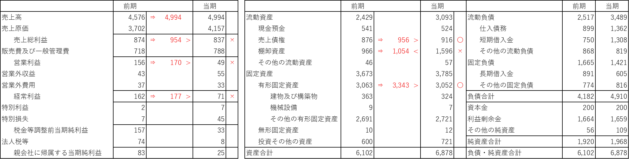 - 売上総利益 : 売上高を揃えた時の954に対し当期は837 ⇒ 売上高総利益率が「悪化」