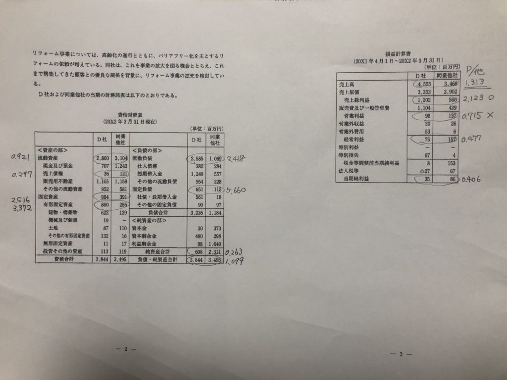 あとは、指標を計算(D社と同業他社の両方計算して優劣を確認)します。