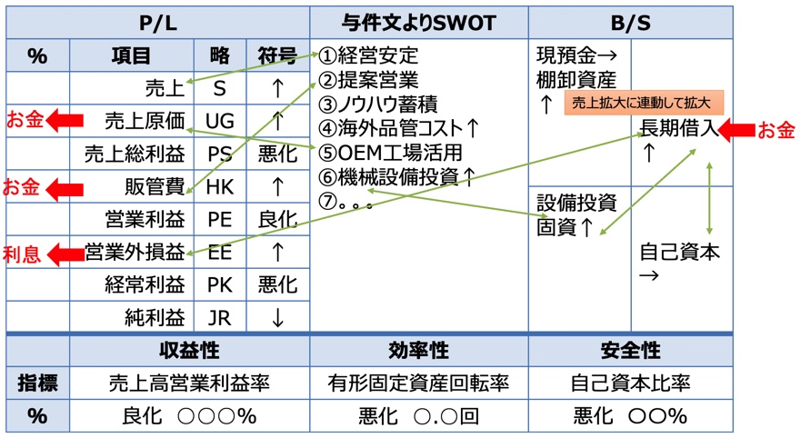 - 記述の解答は、与件文SWOTを理由に何がどうなった、と書く。