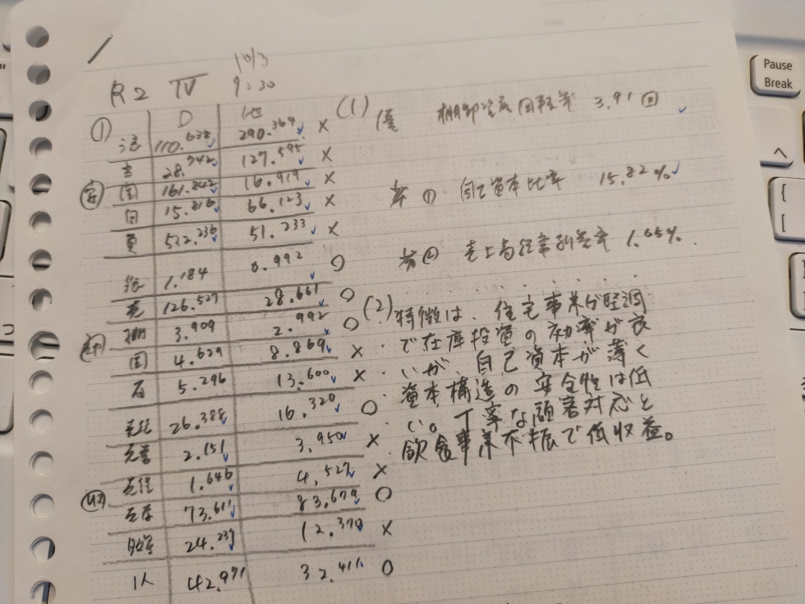 具体的には、最初の1分で問題冊子の表紙を剥がしてメモ用紙を作り、問題文、設問、配点にひととおり目を通し、次の5分で財務指標を全て計算してメモ用紙に記載するという段取りにしました。試験当日は、いきなりバンバン電卓を叩くという受験生は私くらいしかおらず、少し恥ずかしかったのですが、日頃の訓練どおり無心で行うことにより落ち着くことができました。残りの問題は取組み易そうなものから埋め、「とにかく何か書いて爪跡を残す」ことを意識しました。