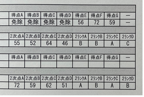 ご参考に令和3年度得点開示の結果です。上から、令和2年の1次、2次、令和3年の1次(免除)、2次の順です。