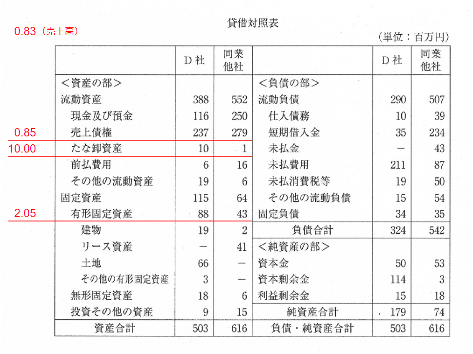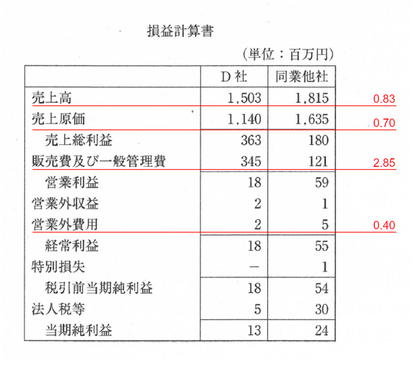 見ての通り、D社の売上高は同業他社の「0.83倍」です。