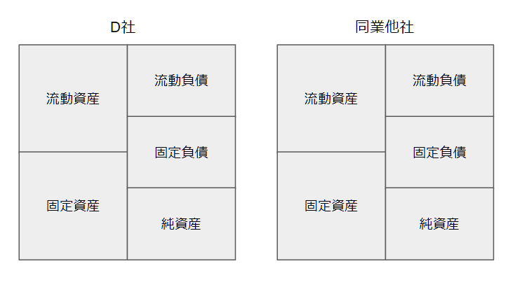 安全性分析においては、D社単体の安全性をみてから、同業他社と比べて優劣を判断することが大切です。