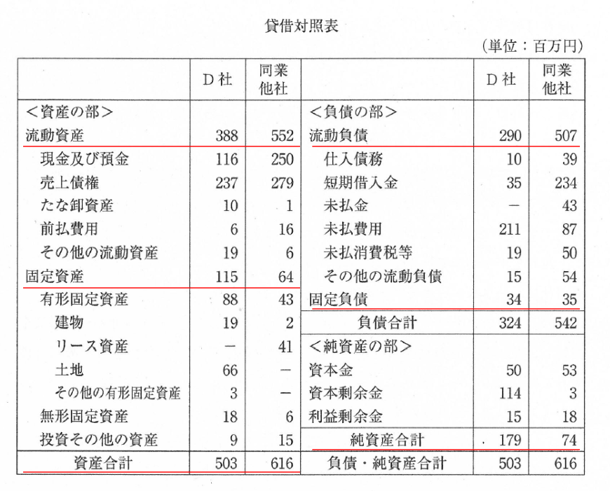 たとえばD社の流動比率が100%を超えていれば、同業他社と比べて劣っていても解答としては優先度が低いと考えられます。