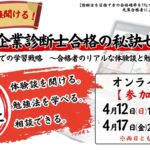 2026年3月20日 / 最終更新日時 : 2026年3月19日 ユーザタキプロ 1-2.タキプロセミナー 【参加無料】中小企業診断士合格の秘訣セミナー!タキプロ流・合格までの学習戦略(4/12・4/17開催) 中小企業診断士試験の合格を目指す方必見!タキプロ17期メンバーが合格の秘訣を伝授する無料セミナーを4/12・4/17に開催します。独学・通信など、あなたのスタイルに合わせた悩み相談も可能です。 詳細は記事をチェック!