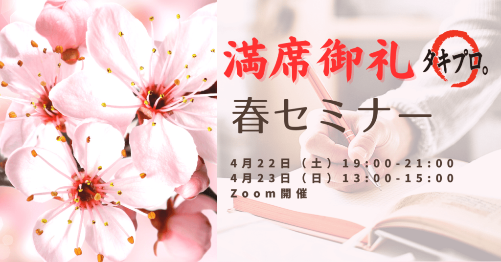 この記事を読んでセミナーに参加してみたいなと思った方は、タキプロの最新情報をチェックしてみてくださいね。(セミナーはHP、ブログ、Facebook、Twitter等でご案内します!)