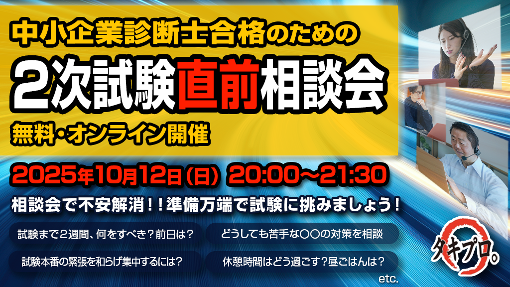 さて、タキプロでは、歩み続ける皆様のお役に立てるよう2次試験突破に向けたセミナーを実施しております。8月スタートダッシュセミナー(8月17日開催)、9月ブーストセミナー(9月7日予定)に続いて、10月12日に2次試験直前相談会を開催いたします!