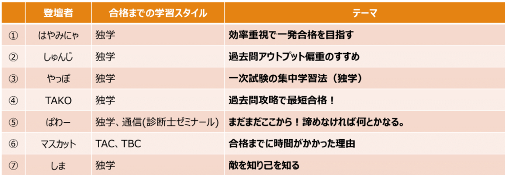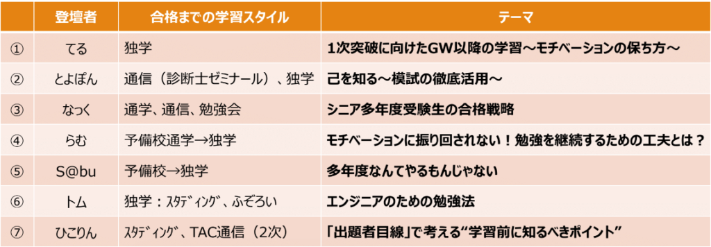 第1部は、様々な学習スタイル・受験回数・幅広い年齢層・異なるバックグラウンドを持つタキメンが登壇し、体験談をご紹介!