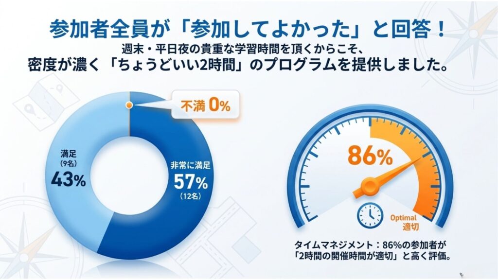 セミナー終了後のアンケートでは、総合満足度100%(非常に満足57%、満足43%)という、大変高い評価をいただきました。ありがとうございます。