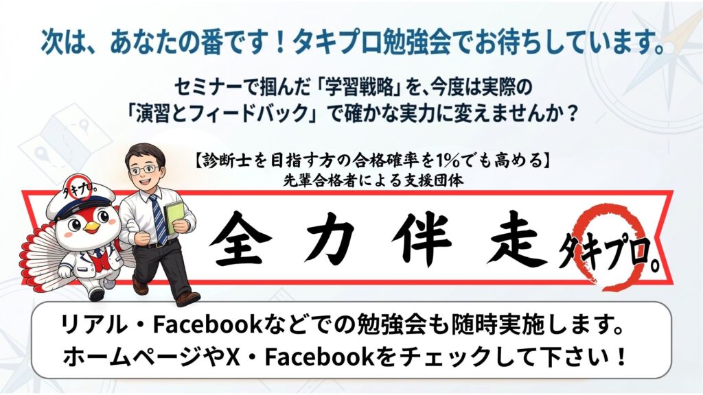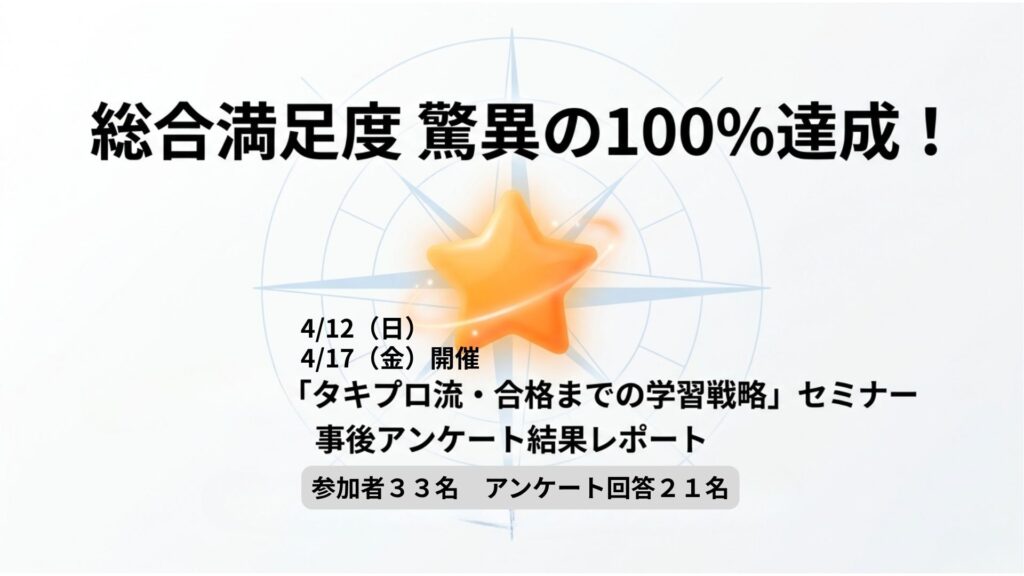 去る4月12日(日)と17日(金)の両日、オンラインにて「タキプロ流 中小企業診断士試験合格までの学習戦略」セミナーを開催いたしました。