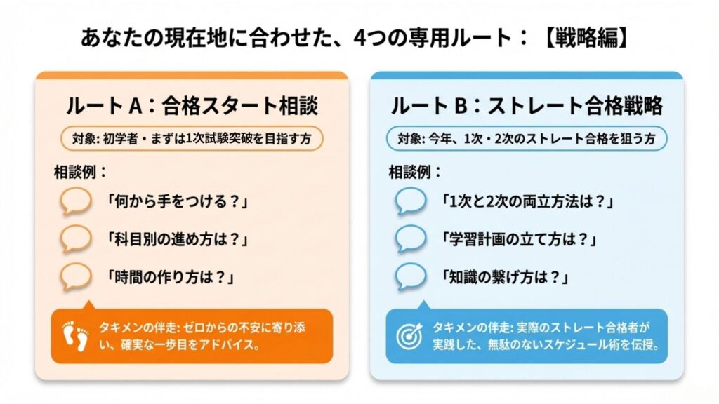 これから勉強を始める方や、今年の1次突破を目標にしている方向け。勉強時間の作り方や科目の進め方をアドバイスします。 - グループB:ストレート合格戦略