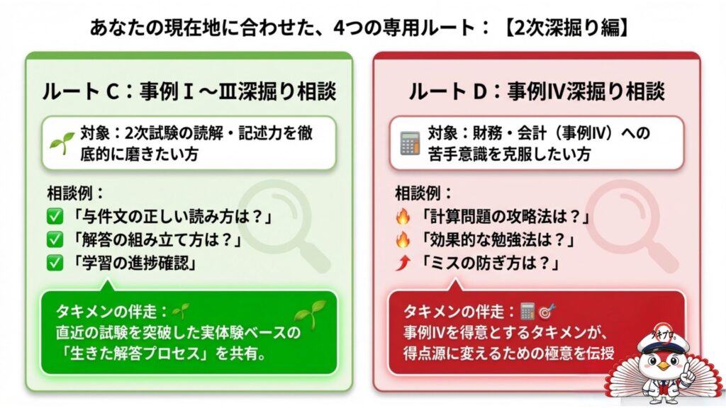 2次試験の事例IからIIIを攻略したい方向け。与件文の読み方や解答の作り方を実体験ベースで解説します。 - グループD:事例IV深掘り相談