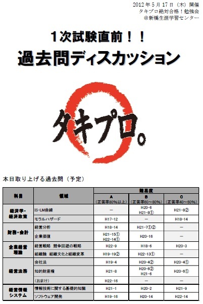 次回の勉強会は2次対策(H21事例Ⅲ)ですが、開始前・終了間際にお渡しします!勉強会への参加は任意。勉強会終了後には意見交換会(懇親会)も予定しているので、書類を受け取った後でタキプロメンバーに勉強方法の質問・相談をしてさらにモチベーションアップ!しちゃってください