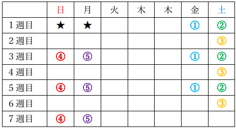 15日間コースは下表の通りです。(名古屋地区のみ木曜日から開始)