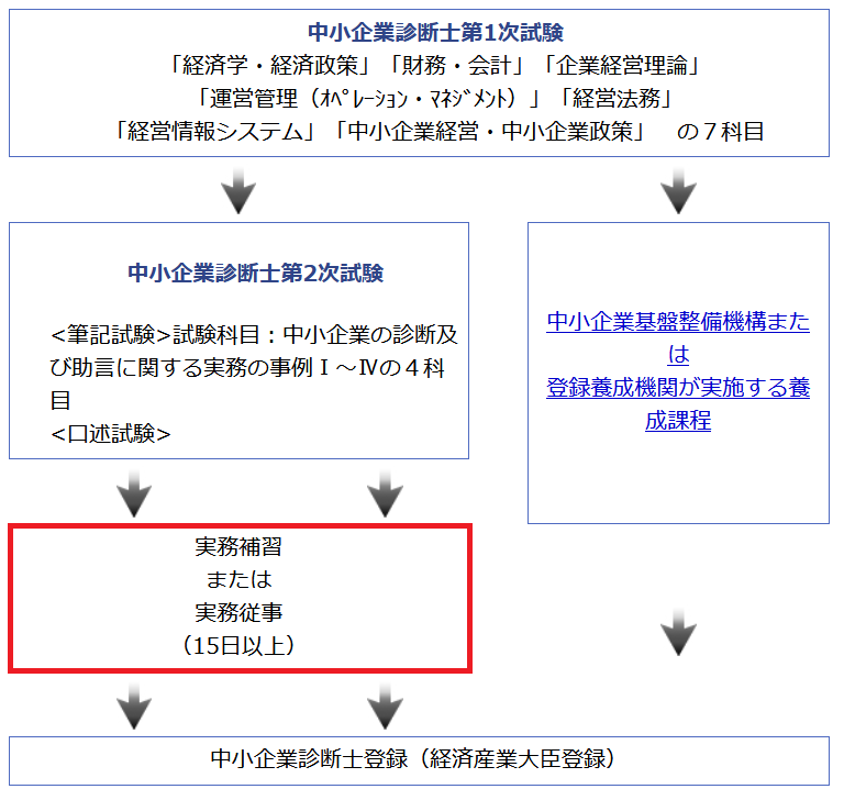 すでにご存じの方も多いと思いますが、中小企業診断士の2次試験(筆記試験、口述試験)に合格しても、すぐに「中小企業診断士」として登録されるわけではありません。登録のためには、15日間以上の「実務補習」または「実務従事」を行う必要があります。