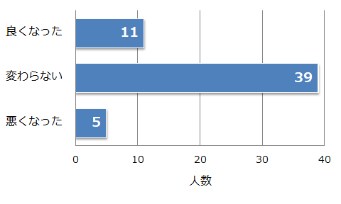 この回答の多さは実に印象的です。いわずもがな、独立に至れば、時間的制約によって家族とすれ違いの増加が考えられます。収入面の不安も伴うかもしれません。ところが、このデータはそんな独立志望者の不安を払拭してくれる力強さがあります。『良くなった』が『悪くなった』を上回る回答数であることにも注目です。独立を果たすと同時に、溢れ出る未来への責任がより一層夫婦間の絆を強くする…そんなきっかけになっているのかもしれません。