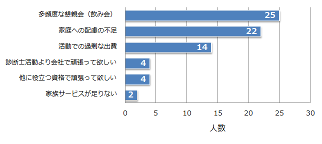 少人数回答の中に「~で頑張って欲しい」というものが2種類あります。これは診断士活動の価値観が家族と共有できていないものと推察されます。診断士活動をすればするほど、夫婦関係に摩擦を引き起こす…そんな危険な状態かもしれません。