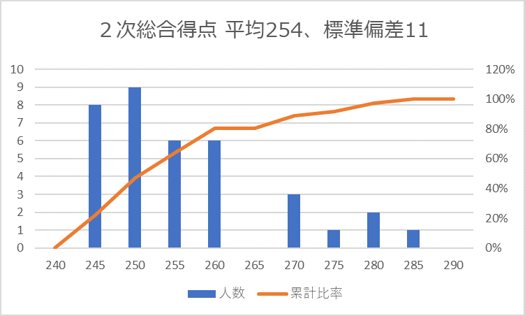 なんと、約5割のタキメンが240点台で、250点台までで、ほぼ8割のメンバーが合格しています。合格者の点数はかなり狭い範囲に集中しています。やはり、この伝説は真実の様です。
