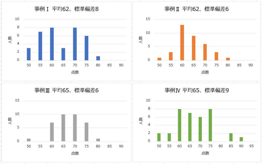 タキメンの科目別獲得点数の内、事例Ⅳの平均点は高くなっています。確かに、タキメン合格者は、事例Ⅳが得意でした。標準偏差をみても、事例Ⅳの点数のバラつきを生みやすい傾向が解ります。