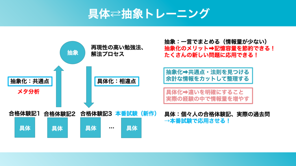 こうした具体(合格体験記)から抽象(メタ分析)を行き来する、具体抽象トレーニングは2次試験のトレーニングとしても応用できます。
