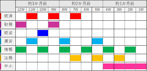 上記の科目別戦略をスケジュール表にしてみたらこんな感じですね。あくまでイメージですし、こんなガントチャートを作るようなことはしませんでしたが、イメージしやすいかなと思って作ってみました。ガントチャートって何だっけ?と思った人は、これで覚えてしまいましょう(笑)
