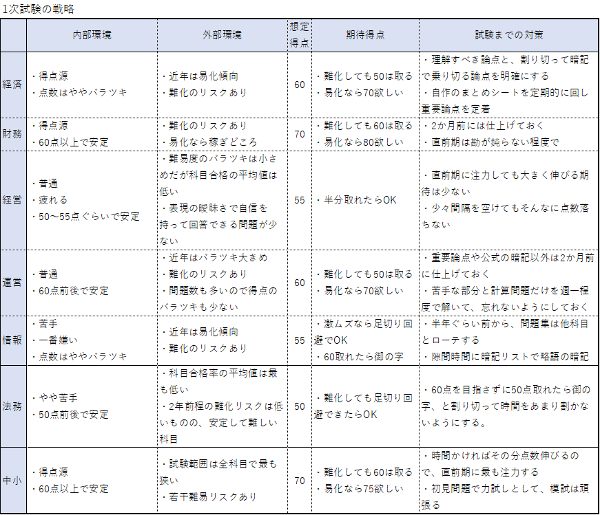 そして、合格に必要な想定点数、自分なりの試験に向けての戦略(戦略というほど大層なもんじゃありませんが…)を一覧のようにまとめてみました。