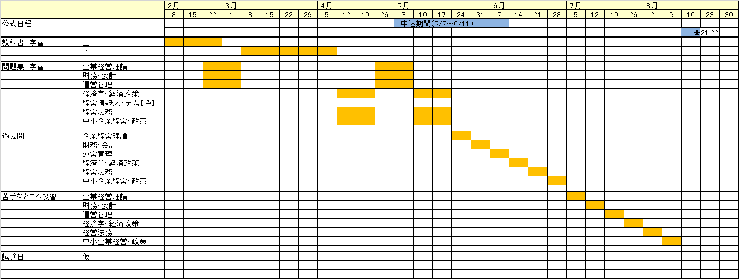 半年あるからなんとかなるかなと思いきや、スケジュールをひいてみると意外に何周もできる余裕がないなという感想で、2次試験の勉強を並行でやる余裕もなさそうなため、最悪2ヵ年計画で行こうという弱気な考えで勉強を開始しました。