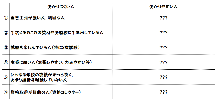 今回は「受かりにくい人の共通点とは」次回に「受かりやすい人の共通点とは」以下6つの観点から対比しつつお伝えしていきたいと思います。