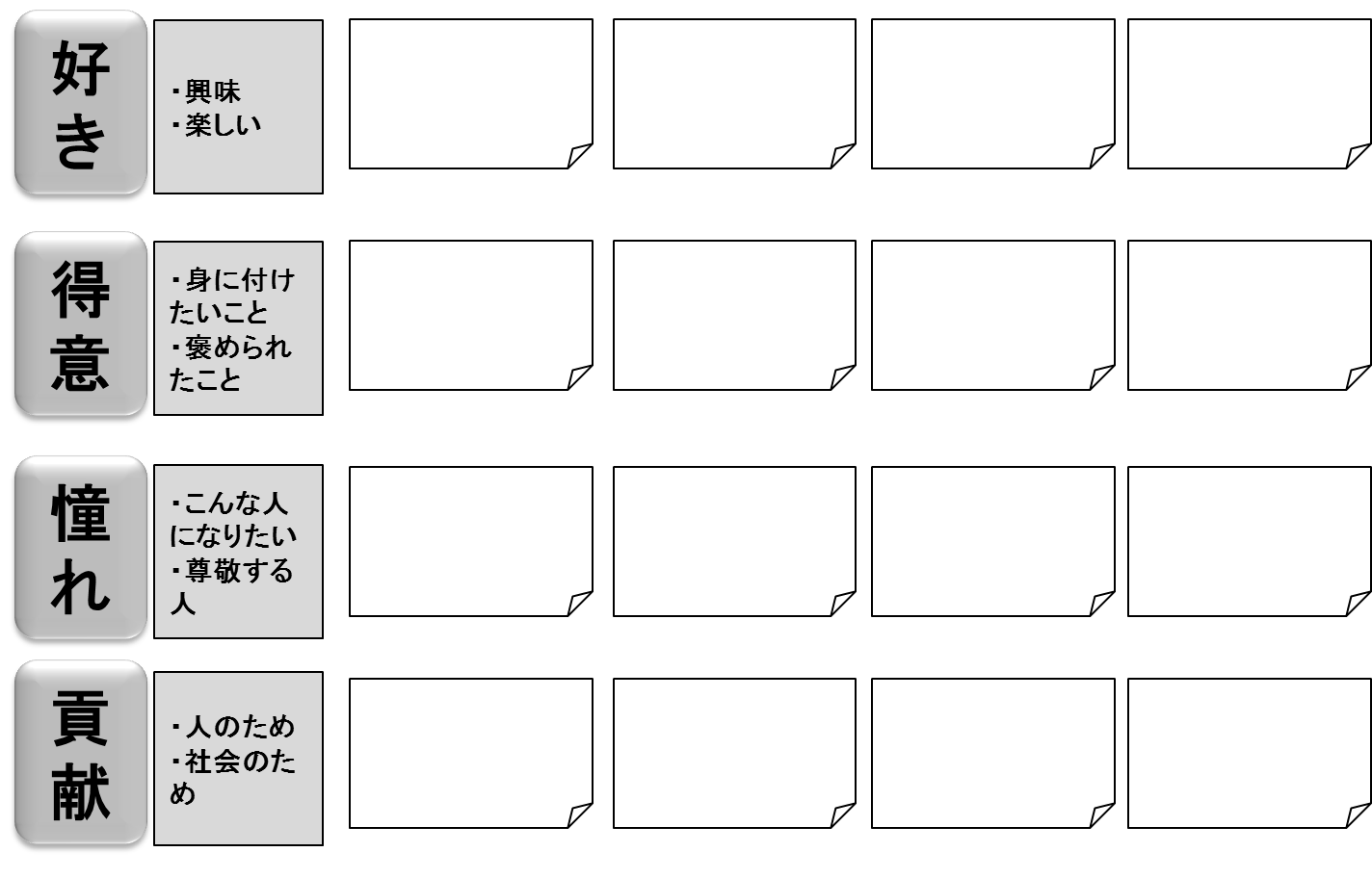 好き、得意、憧れ、貢献の4枚だ。それを繋げればやりたいことになるはずだ。