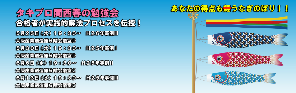 今年もタキプロ関西は「合格者・受験生参加型のみんなで創る勉強会」をキャッチフレーズに、二次試験対策のための勉強会を開催します。