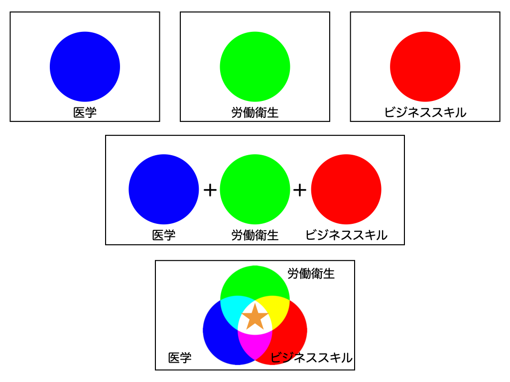 かわけんは専門分野の「医学」と「労働衛生」に関しては水準以上の自信はありませす。ただ、ビジネススキルに関しては、診断士試験には合格しましたがビジネス未経験でもあり完全に水準以下です。全く自信はありません。この3項目の関係を図示しました