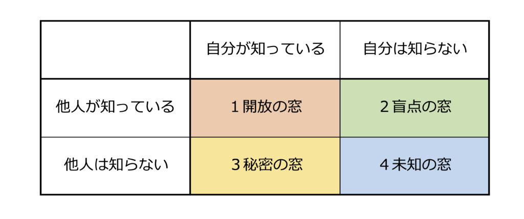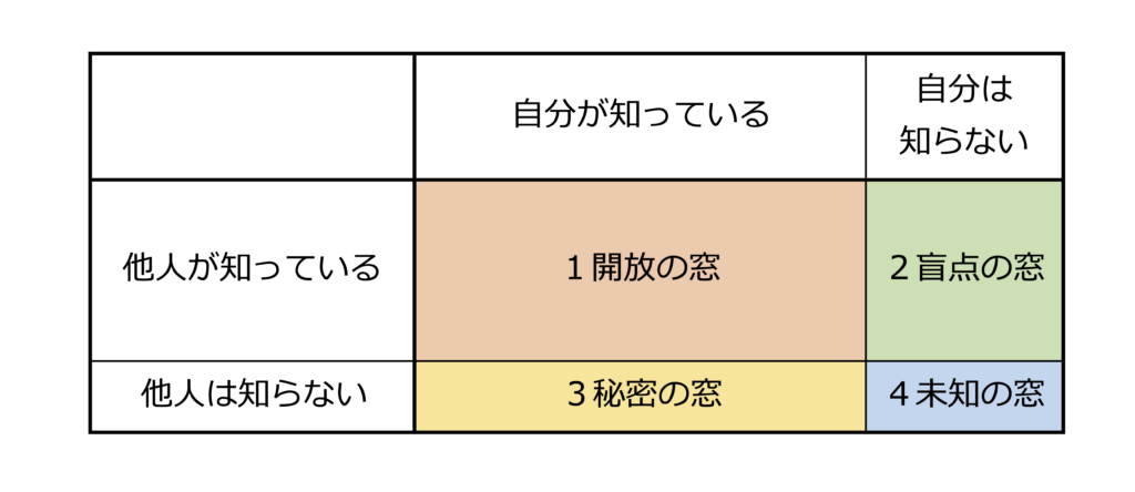 ジョハリの窓と呼ばれる、自分自身を認識するための自己分析ツールがあります。これは他者と自分の関係から自己分析を行い、自己への気づきを促し、人間関係やコミュニケーションの円滑な進め方を模索するために作られたものです。