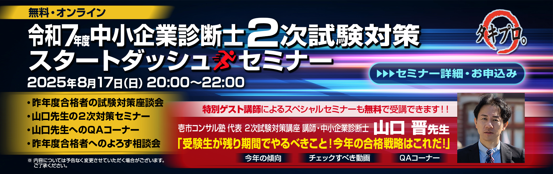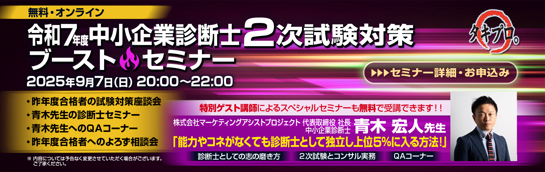 2010年8月14日 / 最終更新日時 : 2021年5月30日 タキプロ 1-2.タキプロセミナー 診断士:2次セミナー迫る!! 受験生のみなさん こんにちは。 人の痛みのわかる診断士になりたいチャンスゲッター@タキプロです。 2次セミナーがいよいよ明日に迫りました 今回もたくさんの方にお申込みいただきました。 貴重な時間とお金を使ってきていただく […]