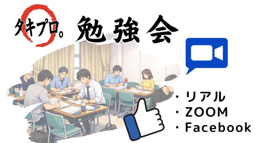 タキプロは、中小企業診断士試験の合格を目指す受験生のために東京・大阪・名古屋の3拠点でのリアル勉強会をはじめ、ZoomやFacebookを利用したオンライン勉強会を開催しています。