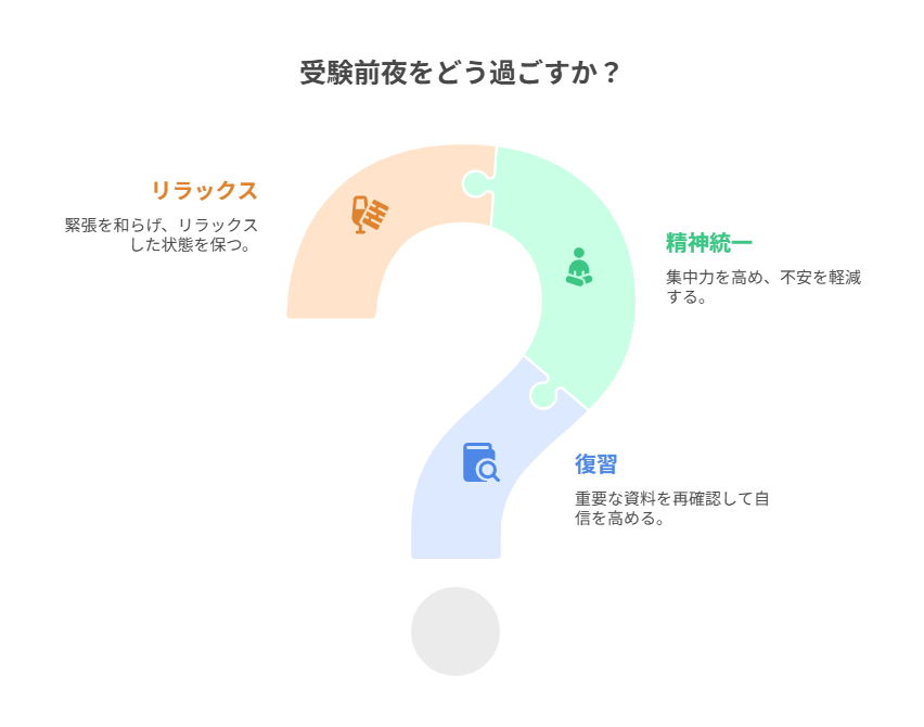 ギリギリまで復習し作成したファイナルペーパーを見直す、温めておいた直近の過去問や論点ABランクの見直し、何も考えず精神統一で無我の境地を開く、お酒を飲んで緊張をほぐす・・・